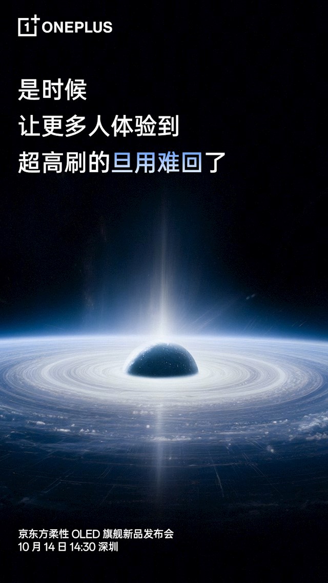 一加中国区总裁李杰表示,全球最先进的一块屏幕——第三代东方屏将于10月14日发布,它将再次引领行业,率先进入全新的165Hz超高刷时代。
