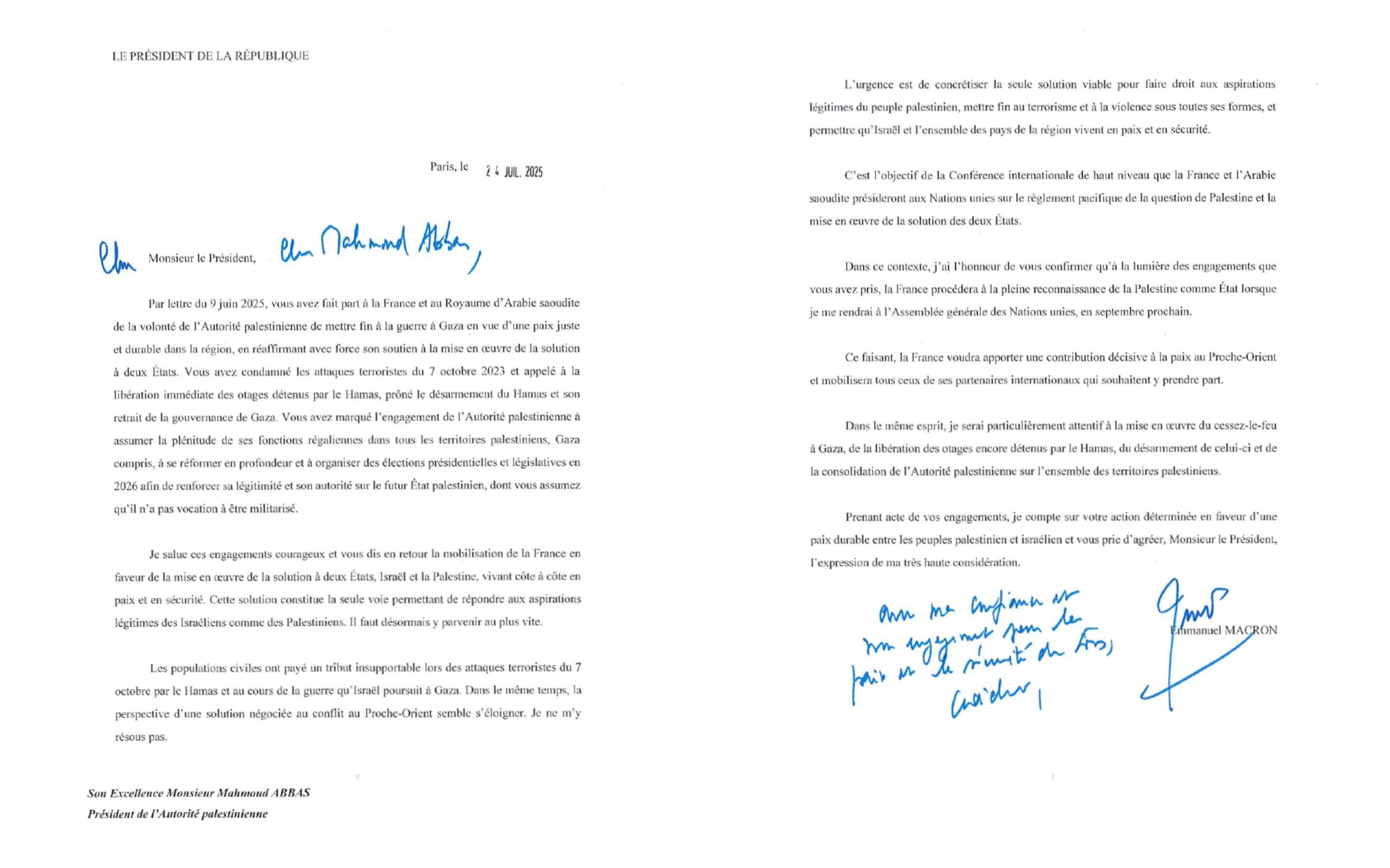马克龙还同时公开了一封写给巴勒斯坦总统阿巴斯的正式信函,强调法国支持“两国方案”中财所,并肯定阿巴斯在推动停火等方面作出的承诺。